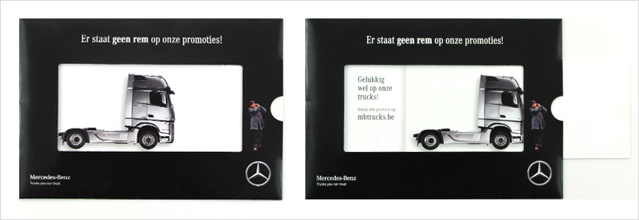 Voor deze campagne koos Mercedes-Benz voor een Lock Schuifkaart om hun promotie rondom remblokken krachtig onder de aandacht te brengen. De inhoud van de kaart is strategisch opgebouwd. Op de voorkant wordt met een krachtige, prikkelende boodschap de aandacht getrokken, waarna je door het paneel te verschuiven stap voor stap de volledige boodschap ontdekt. In het venster verschijnt de concrete promotie-tekst met verwijzing naar de actie, terwijl de eerste tekst zichtbaar blijft dankzij het locksysteem. Zo ontstaat er een duidelijke spanningsopbouw van aandacht naar uitleg en uiteindelijk een gerichte call-to-action, volledig in lijn met de focus op veiligheid en betrouwbaarheid binnen automotive marketing.