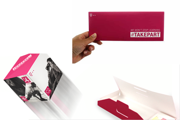 Voor T-Mobile hebben wij een Pop-up Kubus geproduceerd als opvallende direct mail om hun visie en leerdoelen op een originele manier over te brengen. De mailing bestond uit een volledig in roze huisstijl uitgevoerde envelop met logo en campagneboodschap, waaruit bij openen een springende kubus tevoorschijn kwam. Op de kubus werden de ambities en ontwikkelpunten van T-Mobile visueel gepresenteerd, aangevuld met een extra verrassing in de vorm van een zakje snoep. Een creatieve productie waarbij ontwerp, boodschap en beleving perfect op elkaar aansloten.