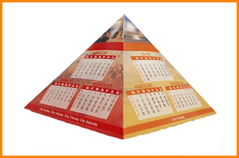 Een piramidevorm die direct opvalt door het unieke silhouet en de vier zijden die elk ruimte bieden voor een eigen kalenderontwerp.