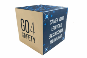 De kubus was strak vormgegeven in de herkenbare huisstijl van GO4SAFETY. Met korte maar krachtige teksten als “Samen voor een veilig en succesvol nieuw jaar.” en “In 2025 we GO4SAFETY” werd direct duidelijk wat de boodschap was. Er was bewust gekozen. Er was bewust gekozen voor een nette opmaak, die door zijn helderheid en slimme lay-out juist extra sterk overkwam.