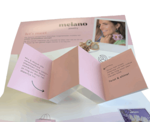 Concept: Een stijlvolle, tastbare mailing waarin het speelse karakter van het Twist & Shine-concept letterlijk voelbaar is. De kaart opent verrassend en laat ontvangers op een visuele én interactieve manier kennismaken met het verwisselbare systeem van Melano-sieraden.