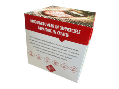 COOKS presenteert zich als bruggenbouwer in commerciële strategie en creatie. Ze wilden die positionering tastbaar maken – en dat is precies wat deze direct mail doet. Op de kubus vind je: